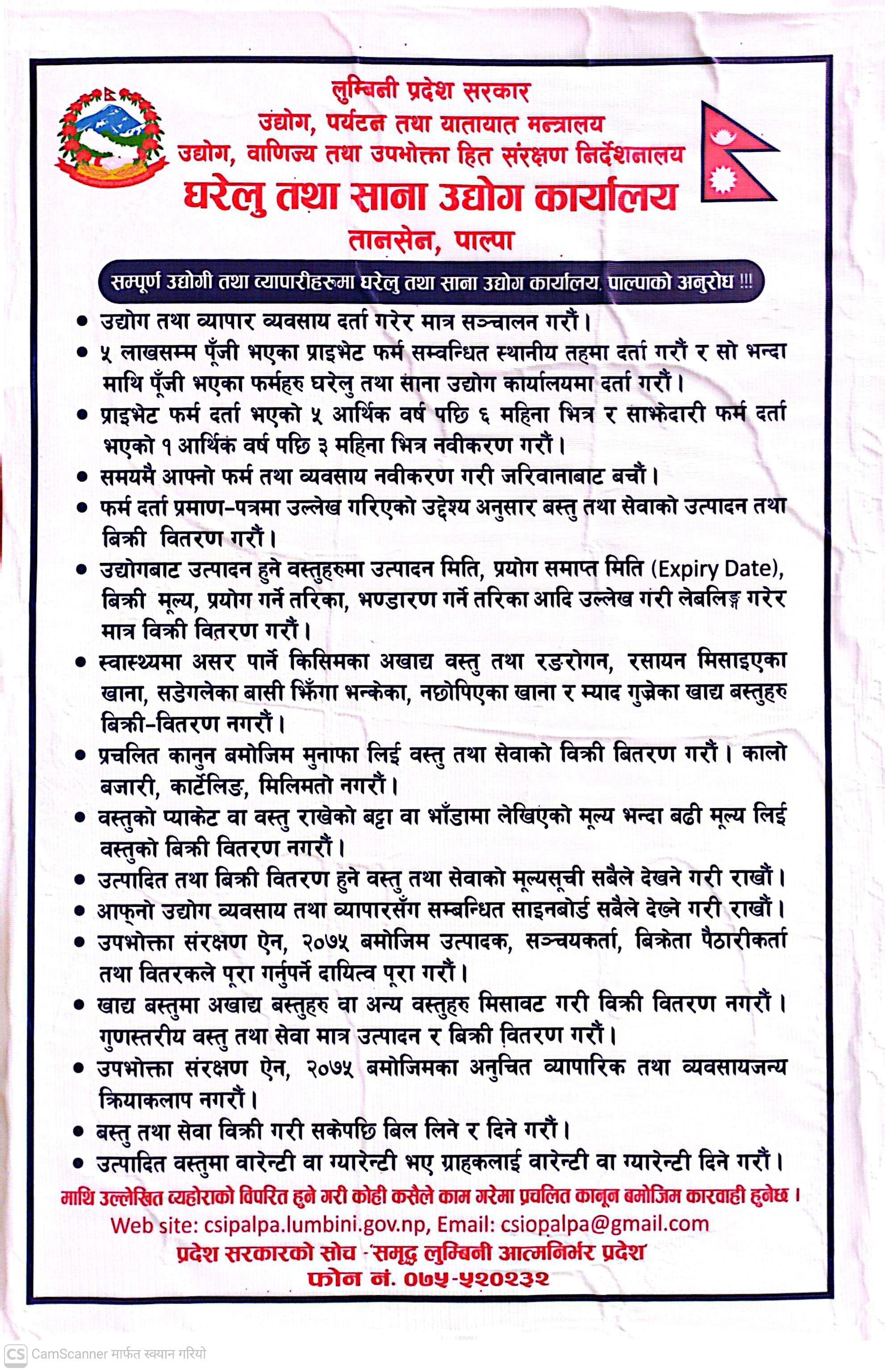 घरेलु तथा साना उद्योग कार्यालयमा रहेको घरेलु इलम केन्द्र लुम्बिनी अञ्चन पाल्पा दर्शक पुस्तकमा भएको विभन्न व्यक्तित्वहरुले गरेको अनुगमनको अभिलेख हेर्ने हो भने भने घरेलु तथा साना उद्योग कार्यालय पाल्पाको स्थापना २०२० साल तिर घरेलु इलम केन्द्र लुम्बिनी अञ्चल तानसेन पाल्पाको रुपमा भएको देखिन्छ तर घरेलु तथा साना उद्योग विभागको वेवसाईटमा हेर्ने हो भने घरेलु इलमको प्रचार गर्ने उद्देश्यका साथ आ.व.२०२१/२२ मा अञ्चल केन्द्रको अवधारणा सहित १४ वटा अञ्चलमा घरेलु ईलम केन्द्र स्थापना भएको देखिन्छ । पछि वि.सं. २०३० सालमा उद्योग प्रशासन समेतको काम गर्ने गरी घरेलु तथा ग्रामिण उद्योग कार्यालयको रुपमा नाम परिवर्तन भएको थियो । वि.स. २०४९ मा घरेलु तथा साना उद्योग कार्यालय पाल्पा नामाकारण गरियो । देश संघीयतामा गई सकेपछि नेपाल सरकारको उद्योग विभाग अन्तरगत रहेको यस कार्यालय वि.स. २०७५ सालमा नेपाल सरकारले प्रदेश सरकारलाई हस्तान्तरण गरेपछि उद्योग, वाणिज्य, वन तथा वातावरण मन्त्रालय अन्तरगत रह्यो । हाल लुम्बिनी प्रदेश सरकारको उद्योग, पर्यटन तथा यातायात मन्त्रालय अन्तरगत यस कार्यालय रहेको छ ।